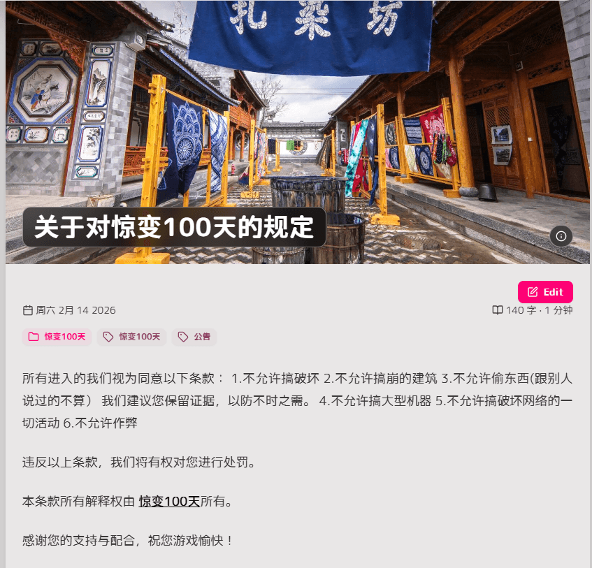 惊变100天由于过年期间暂时关闭,于2026年2月23日晚18点恢复。