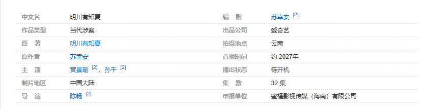 明川有知夏》是一部改编自苏幸安同名小说的32集当代涉案电视剧,由陈畅执导,蜜橘影视传媒(海南)有限公司申报,爱奇艺、金禾影视出品,计划于2026年3月在云南开机拍摄 [3-4] [6-7]。 该剧主线聚焦动物医学硕士与森林警察从校园初遇到可可西里重逢,最终联手对抗盗猎分子、守护野生动物的故事,融合了野生动物保护、职业元素与言情主线。据网络爆料,该剧拟由黄景瑜主演。